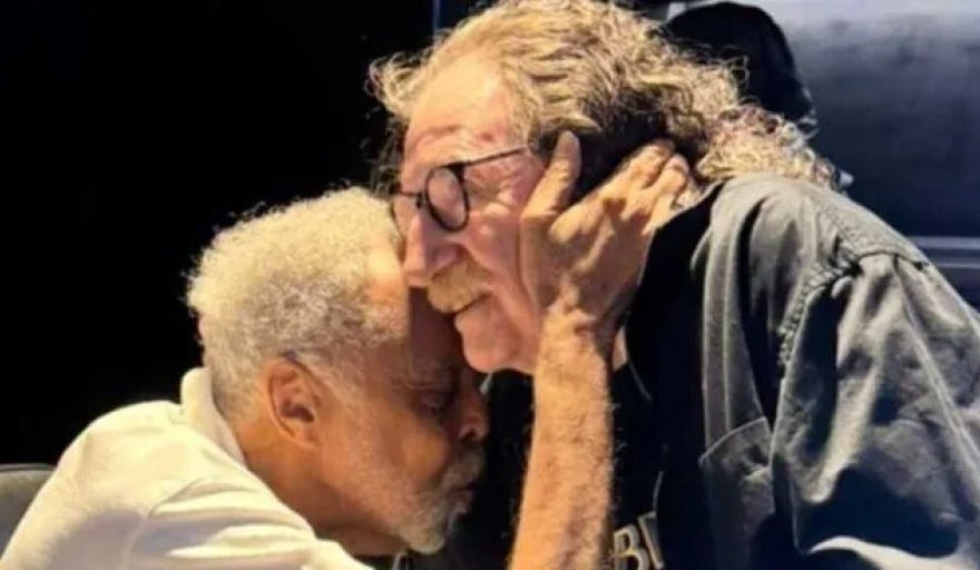 Gilberto Gil e Charly García se abraçaram nos bastidores do Movistar Arena, em Buenos Aires, onde Gil se apresentou pela turnê “Tempo Rei”, um dos últimos capítulos de sua despedida dos grandes palcos internacionais. Charly estava na plateia e, depois do show, foi direto ao camarim.